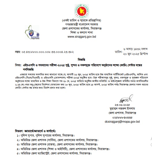 এইচএসসি পরীক্ষা ২০২৫ চলাকালীন সিরাজগঞ্জ জেলার সকল ধরনের কোচিং সেন্টার বন্ধ রাখার গণবিজ্ঞপ্তি দিয়েছে জেলা প্রশাসন।
