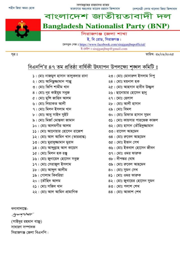 বাংলাদেশ জাতীয়তাবাদী দল-বিএনপির ৪৭তম প্রতিষ্ঠাবার্ষিকী উপলক্ষে সিরাজগঞ্জে আয়োজিত র্যালি সুষ্ঠুভাবে ও শৃঙ্খলভাবে পালনের লক্ষ্যে শৃঙ্খলা উপ-কমিটি গঠন করা হয়েছে।