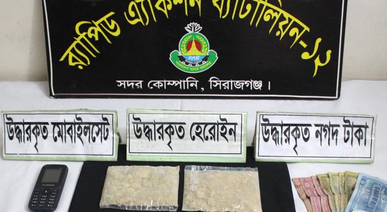 রবিবার (২১ সেপ্টেম্বর) গভীর রাতে সলঙ্গা থানাধীন রামারচর এলাকায় রাজশাহী থেকে ঢাকাগামী মহাসড়কে র্যাব-১২ এর একটি দল এ অভিযান চালায়। এ সময় লুনা বেগমকে ৭৫ গ্রাম হেরোইনসহ আটক করা হয়। তার কাছ থেকে হেরোইন বিক্রির কাজে ব্যবহৃত একটি মোবাইল ফোন ও নগদ ২১০ টাকা জব্দ করা হয়েছে।