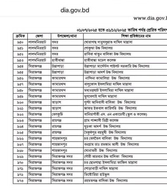 সারাদেশের ৯৭৩টি শিক্ষাপ্রতিষ্ঠানের সর্বশেষ পরিদর্শন ও নিরীক্ষা প্রতিবেদনের তালিকা প্রকাশ করেছে শিক্ষা মন্ত্রণালয়ের অধীন পরিদর্শন ও নিরীক্ষা অধিদপ্তর। প্রকাশিত তালিকায় সিরাজগঞ্জ জেলার ২০টি শিক্ষাপ্রতিষ্ঠানের নাম অন্তর্ভুক্ত হয়েছে।