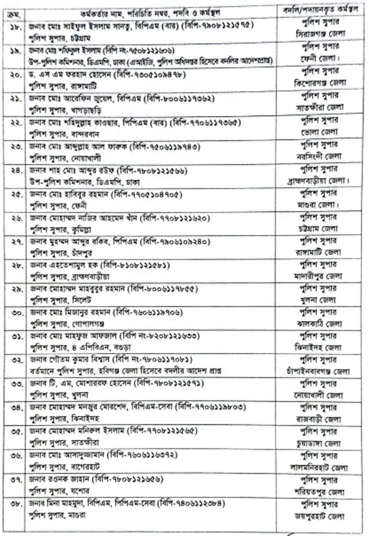 বুধবার সরকারের জারি করা প্রজ্ঞাপনে একযোগে দেশের ৬৪ জেলার নতুন পুলিশ সুপার নিয়োগ চূড়ান্ত করা হয়।
