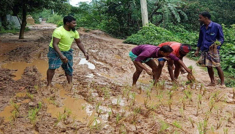 সিরাজগঞ্জ জেলার রায়গঞ্জ উপজেলার ধামাইনগর ইউনিয়নের প্রতাবদিঘী এলাকার আড়াই কিলোমিটার কাঁচা রাস্তা সামান্য বৃষ্টিতেই কাদার স্রোতের নালায় পরিণত হয়েছে। এতে চরম ভোগান্তিতে পড়েছেন ১০ গ্রামের হাজার বাসিন্দা। প্রতিবাদ জানাতে স্থানীয়রা ওই কাদা রাস্তায় ধানের চারা রোপণ করেছেন।