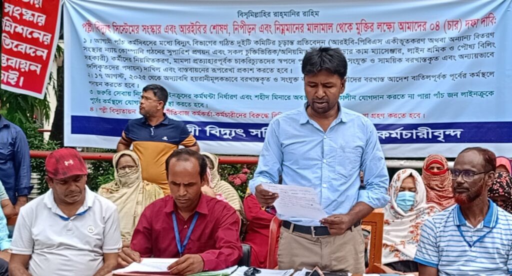ভুক্তভোগী লাইন টেকনিশিয়ান মোঃ জামিলুল ইসলাম লিখিত বক্তব্যে অভিযোগ করেন, পল্লী বিদ্যুতায়ন বোর্ড প্রতিশ্রুতি ভঙ্গ করেছে। ১৭, ২৭ ও ২৮ আগস্টে ৩০ কর্মচারীকে বরখাস্ত করায় কর্মীরা বিক্ষুব্ধ হয়েছেন। ডিজিএম মাহফুজুর রহমান বলেন, সরকারের লিখিত আশ্বাসেও পূর্বের সংকট নিরসন হয়নি, বরং হয়রানি অব্যাহত আছে।