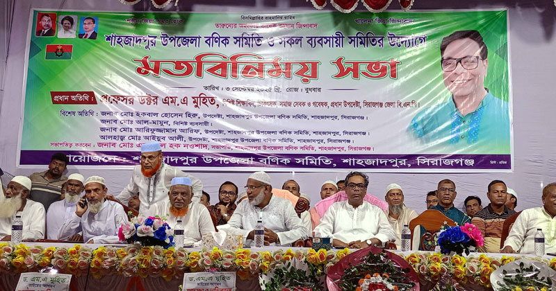 সিরাজগঞ্জের শাহজাদপুরে উপজেলা বণিক সমিতি ও বিভিন্ন ব্যবসায়ী সংগঠনের নেতাদের সঙ্গে স্থানীয় বিএনপি নেতৃবৃন্দের মতবিনিময় সভা অনুষ্ঠিত হয়েছে। গত বুধবার (৩ সেপ্টেম্বর) রাত ৯টায় দ্বারিয়াপুর বাজারে উপজেলা বণিক সমিতির আয়োজনে এ সভা অনুষ্ঠিত হয়। সভায় সভাপতিত্ব করেন উপজেলা বণিক সমিতির সভাপতি এমদাদুল হক নওশাদ এবং সঞ্চালনা করেন শাহজাদপুর প্রেস ক্লাবের সাধারণ সম্পাদক আল আমিন। সভায় প্রধান অতিথি হিসেবে উপস্থিত ছিলেন সিরাজগঞ্জ জেলা বিএনপির প্রধান উপদেষ্টা ড. এম এ মুহিত। তিনি বলেন, “ব্যবসায়ীরাই দেশের অর্থনীতির চালিকা শক্তি। বাংলাদেশ জাতীয়তাবাদী দল সব সময়ই ব্যবসায়ীদের পাশে ছিল, আছে এবং ভবিষ্যতেও থাকবে।” একইসাথে তিনি আসন্ন জাতীয় সংসদ নির্বাচনে ধানের শীষ প্রতীকে বিএনপিকে বিজয়ী করতে ব্যবসায়ীদের সহযোগিতা কামনা করেন। বিশেষ অতিথি হিসেবে উপস্থিত ছিলেন উপজেলা বিএনপির সাবেক সভাপতি ইকবার হোসেন হিরু, সাবেক সাধারণ সম্পাদক মো. আরিফুজ্জামান আরিফ, সাবেক পৌর বিএনপির সভাপতি আলহাজ্ব আইয়ুব আলী। এ ছাড়া উপজেলার বিভিন্ন ব্যবসায়ী সমিতির সভাপতি-সাধারণ সম্পাদকসহ অসংখ্য ব্যবসায়ী ও নেতৃবৃন্দ মতবিনিময় সভায় অংশ নেন।