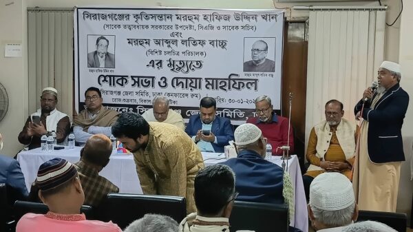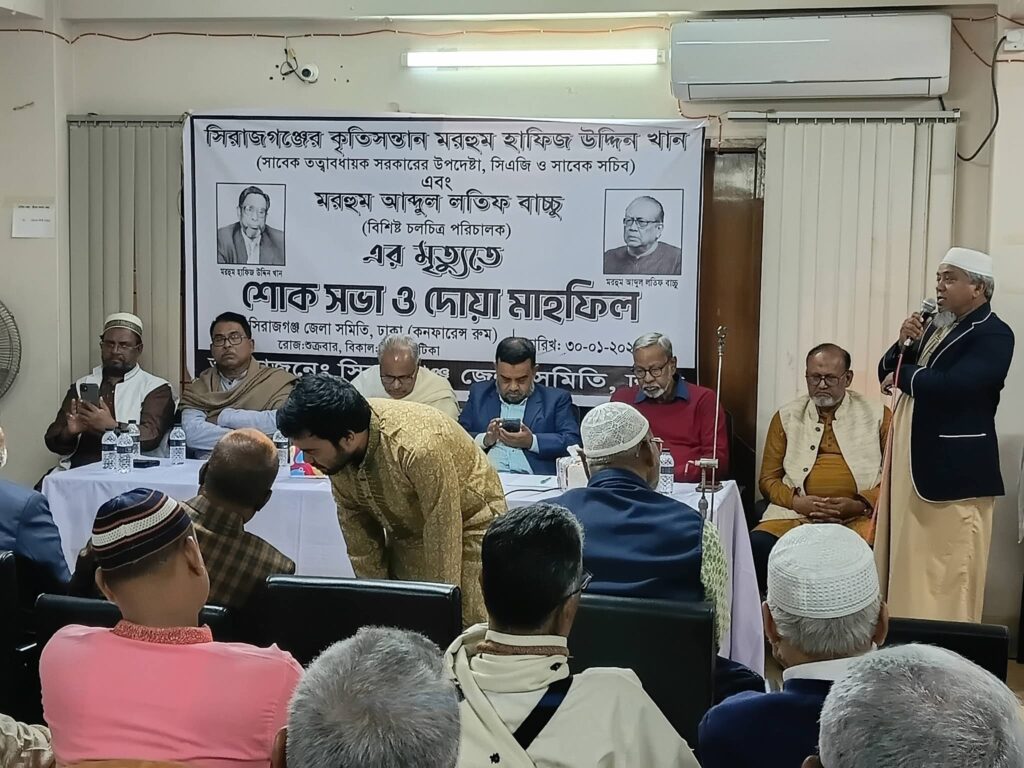 সিরাজগঞ্জ জেলা সমিতির উদ্যোগে সদ্য প্রয়াত সিরাজগঞ্জের কৃতিসন্তান মরহুম হাফিজ উদ্দিন খান (সাবেক তত্ত্বাবধায়ক সরকারের উপদেষ্টা) এবং বিশিষ্ট চলচ্চিত্র পরিচালক আব্দুল লতিফ বাচ্চুর স্মরণসভা ও দোয়া মাহফিল অনুষ্ঠিত হয়েছে।