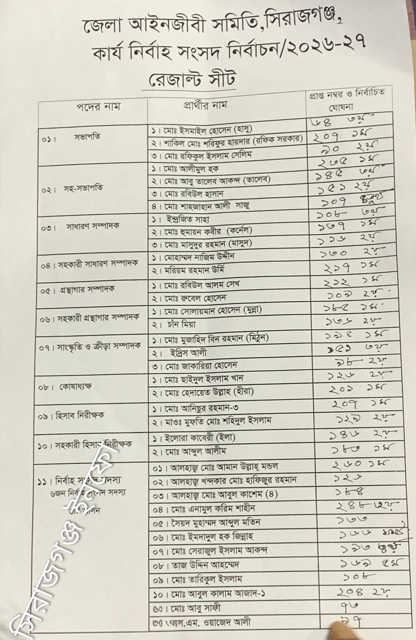 সিরাজগঞ্জ জেলা আইনজীবী সমিতির কার্যনির্বাহী সংসদ নির্বাচন ২০২৬–২৭ এর ফলাফল ঘোষণা করা হয়েছে। নির্বাচনে সভাপতি, সাধারণ সম্পাদকসহ বিভিন্ন পদে জাতীয়তাবাদী শক্তি প্যানেল থেকে নতুন নেতৃত্ব নির্বাচিত হয়েছেন। সমিতির প্রকাশিত ফলাফল শিট অনুযায়ী বিজয়ীদের নাম ঘোষণা করা হয়।