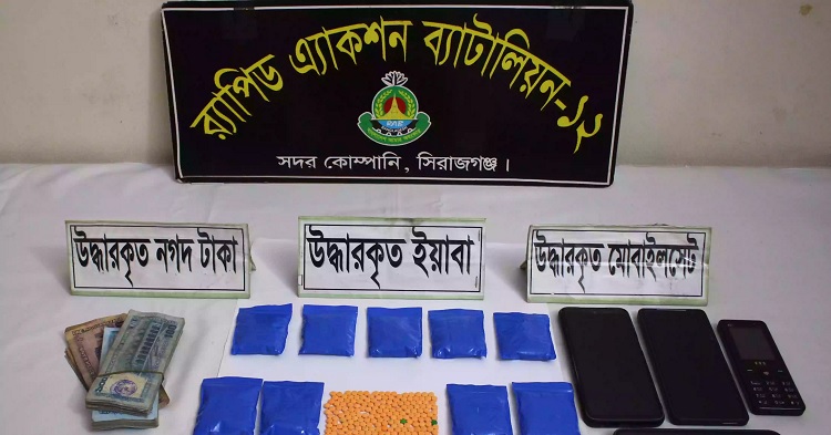 সিরাজগঞ্জে বিপুল পরিমাণ ইয়াবা ট্যাবলেটসহ তিন মাদক কারবারিকে গ্রেপ্তার করেছে র্যাপিড অ্যাকশন ব্যাটালিয়ন (র্যাব)। প্রায় দুই হাজার ইয়াবাসহ তাদের ন্যাশনাল ফুড ভিলেজ হাইওয়ে হোটেল অ্যান্ড রেস্টুরেন্টের সামনে থেকে গ্রেপ্তার করা হয়। রোববার (৩১ আগস্ট) সকাল সাড়ে ১০টার দিকে সলঙ্গা থানার ধোপাকান্দি এলাকায় এ অভিযান চালায় র্যাব-১২। র্যাব-১২-এর মিডিয়া অফিসার এক সংবাদ বিজ্ঞপ্তিতে এ তথ্য নিশ্চিত করেছেন। গ্রেপ্তারকৃতরা হলেন— পাবনা জেলা সদরের রাধানগর গ্রামের মো. আমিনুল ইসলাম রনি (৪৫), দোহারপাড়া গ্রামের মো. রাশেদ রানা (৪২) ও সুজানগর উপজেলার ভবানিপুর গ্রামের মো. আব্দুল মজিদ মন্ডল (৪৮)। বিজ্ঞপ্তিতে বলা হয়েছে, গতকাল (রোববার) সকাল সাড়ে ১০টার দিকে ধোপাকান্দি এলাকার ন্যাশনাল ফুড ভিলেজ হাইওয়ে হোটেল অ্যান্ড রেস্টুরেন্টের সামনে অভিযান চালিয়ে তাদের গ্রেপ্তার করা হয়। এ সময় তাদের কাছ থেকে ১ হাজার ৯৭৭ পিস ইয়াবা ট্যাবলেট উদ্ধারসহ নগদ ২০ হাজার ২২০ টাকা ও চারটি মোবাইল ফোন জব্দ করা হয়। গ্রেপ্তারকৃত আসামিরা দীর্ঘদিন ধরে কক্সবাজার থেকে ইয়াবা সংগ্রহ করে সিরাজগঞ্জসহ দেশের বিভিন্ন জেলায় ক্রয়-বিক্রয় করে আসছিল, তাদের বিরুদ্ধে সলঙ্গা থানায় মাদকদ্রব্য নিয়ন্ত্রণ আইনে মামলা করা হয়েছে বলে সংবাদ বিজ্ঞপ্তিতে আরও জানানো হয়।